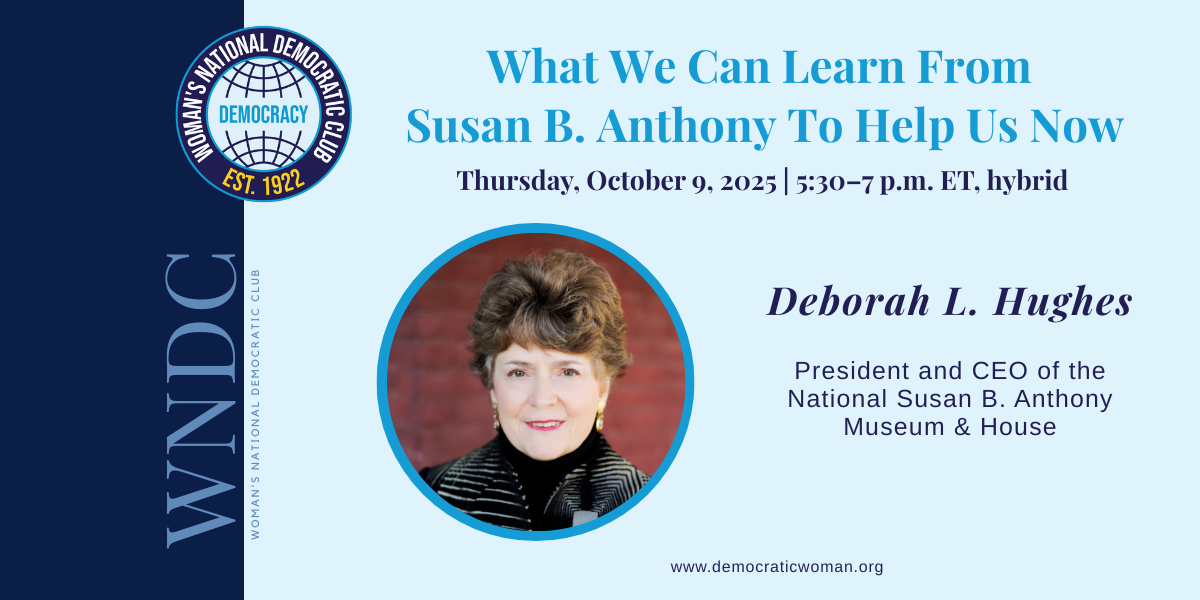 For non-member event reservations: please email pfitzgerald@democraticwoman.org or telephone 202-232-7363 Ext. 402 (voicemails will also be accepted). What if the key to navigating today’s challenges lies in the wisdom of the past? Join WNDC and Deborah L. Hughes, president and CEO of the National Susan B. Anthony Museum & House, for a powerful and thought-provoking program on the life and legacy of the courageous women who fought tirelessly for human rights and voting rights in a nation built on the promise of democracy. At a time when division and discouragement can feel overwhelming, the stories of Susan B. Anthony and her fellow suffragists remind us that change is possible. Together, we’ll explore how their struggles and victories can guide, inspire, and empower us today. Let’s learn from the past to strengthen our present and shape a better future. EVENT DETAILS: