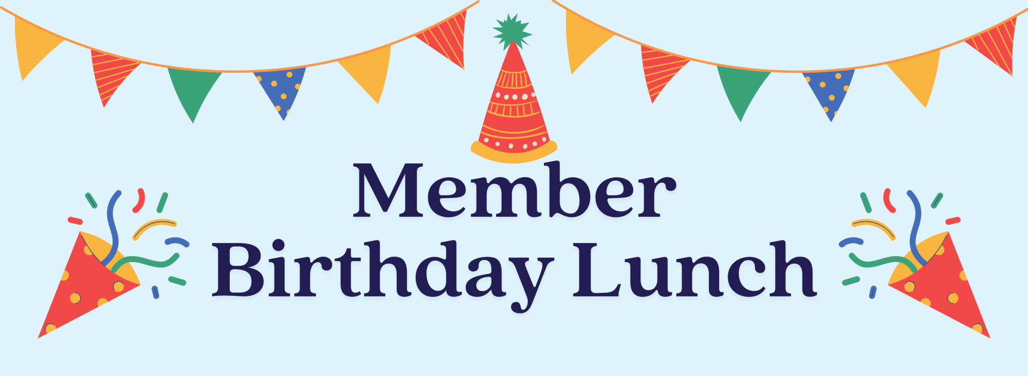 Come celebrate members' birthday! During your birthday month, your lunch will be complimentary. If it is not your birthday month, we encourage you to join us in the festivities for a standard member lunch price. Non-member family and friends are also very welcome! The registration process is the same as a regular lunch reservation. |