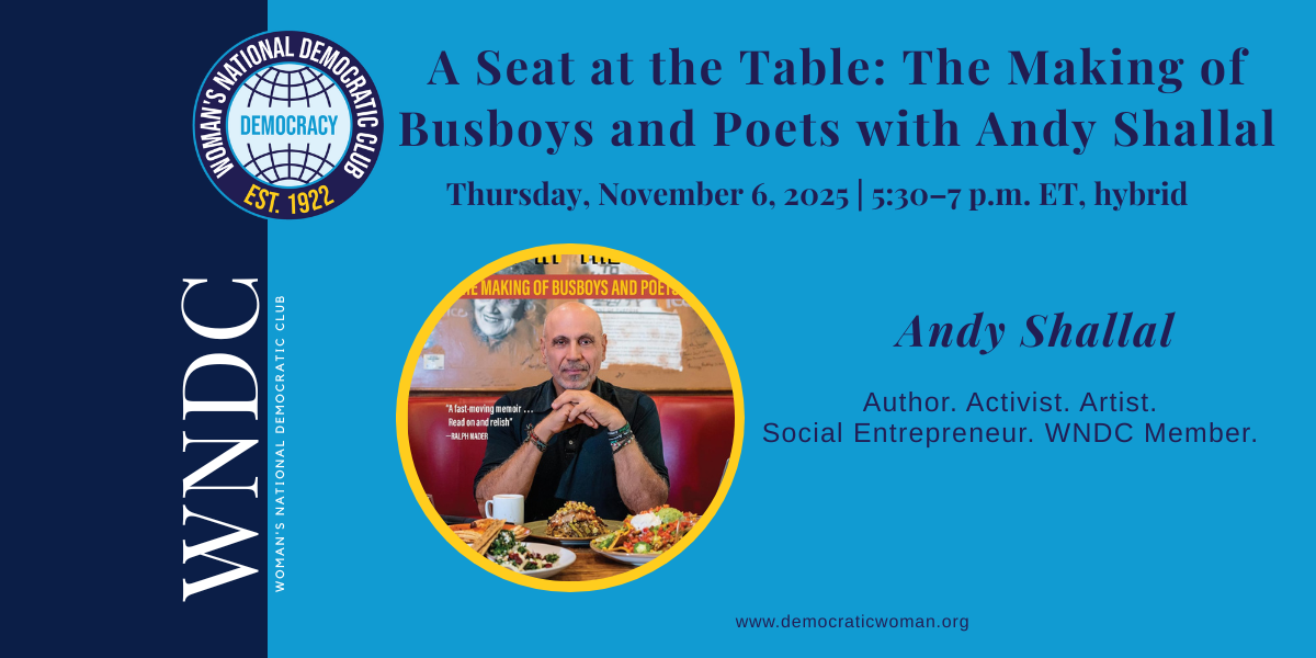 For non-member event reservations: please email pfitzgerald@democraticwoman.org or telephone 202-232-7363 Ext. 402 (voicemails will also be accepted). Please join us at the WNDC for a special event celebrating "A Seat at the Table: The Making of Busboys and Poets," the inspiring new book by activist, artist, social entrepreneur, and WNDC member Andy Shallal. Shallal will share the story of how he founded and transformed a single restaurant in Washington, D.C. into a cultural and political hub where activism, art, and community intersect. This event will explore the themes of the book with engaging conversation, meaningful connections, and a celebration of local voices.